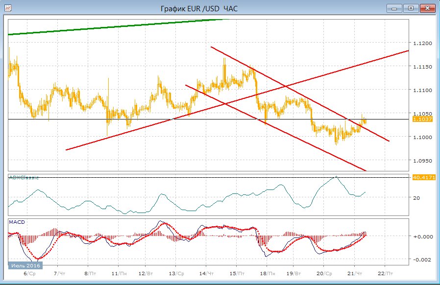 Евро с утра пробил верхнюю границу своего нисходящего канала, которая располагалась на на 1,10205, но сделал это без импульса и последующего сильного движения. Это говорит о том, что канала или тренда вверх после такого «жеванного» пробоя ожидать не стоит. Скорее всего, теперь пара уйдет в достаточно широкий боковик, границы которого пока назвать трудно, но примерно 1,1070 и 1,0990. Так что если совсем не терпится зайти в рынок то мы бы рекомендовали перейти на 15-минутки и достать из запасов любимый осциллятор, сигналы которого вы умеете хорошо фильтровать: Stochastic, RSI или MACD. Дня 3 можно будет неплохо поторговать в боковике по его сигналам.