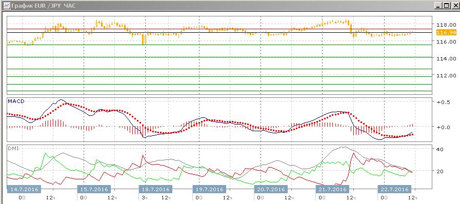 На четырёхчасовом графике возвращение ниже 117,35 и новое краткосрочное тестирование уровня 118,00 может привести к развороту. Пики выше 118,00 можно рассматривать как двойную вершину, после которой знаком разворота было бы снижение ниже 115,50, что является промежуточным минимумом. По индикаторам направленного движения немного предпочтительно снижение (гистограмма MACD находится в отрицательной области, линия MACD снижается), но в целом движение идёт во флэте. Если рассматривать движение в канале между 115,50 и 118,00, то сейчас происходит снижение от верхней границы, и текущая остановка около 116,75, скорее, завершится возобновлением снижения.