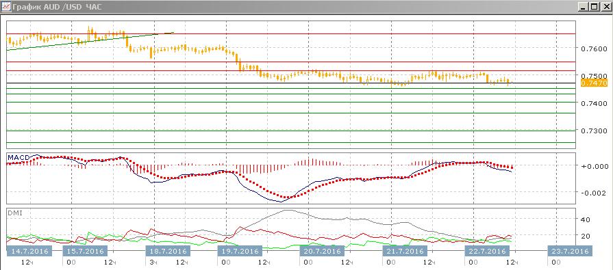 На четырёхчасовом графике пара находится в узком диапазоне ниже 0,7515. Последовательно снижения относительных максимумов пары не нарушена, с ближайшей целью стоит ожидать снижения до 0,7450, предыдущего относительного минимума. Выход из консолидации ниже 0,7515 вниз видится предпочтительным, так как это тенденция до консолидации. По индикаторам направленного движения тенденцией является снижение — DM- значительно и и устойчиво выше DM+, коррекционное движение вверх было видно по росту гистограммы MACD и разворота линии MACD.