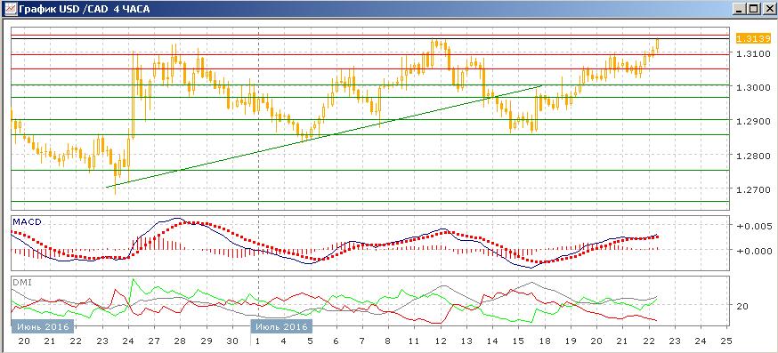 На четырёхчасовом графике пара продолжает расти от 1,2855. По ADX превышение DM+ над DM- является устойчивым, линия MACD растёт. Однако видно замедление роста — образовалось медвежье расхождение максимумов пары и гистограммы MACD. Так как пара достигла важного уровня сопротивления (максимума 11 июля), рассчитывать на рост до преодоления этого уровня слишком рискованно, а идти против хорошо выраженной тенденции роста при отсутствии признаков разворота также не стоит.