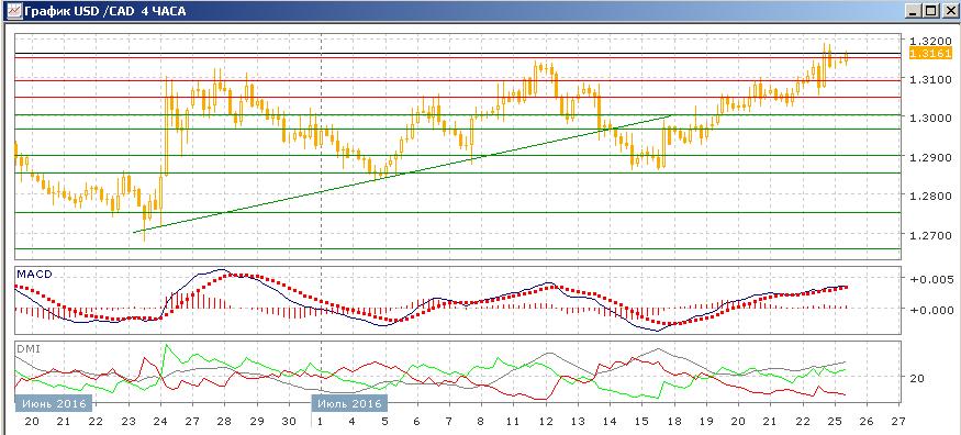 На четырёхчасовом графике пара продолжает расти от 1,2855. По ADX превышение DM+ над DM- увеличивается, линия MACD растёт. Гистограмма MACD продолжает снижение, но остаётся в положительной области. Медвежье расхождение максимумов пары и гистограммы MACD сохраняется, но преодоление уровня 1,3150 делает его образование менее значимым. По-прежнему, продолжение роста видится предпочтительным.