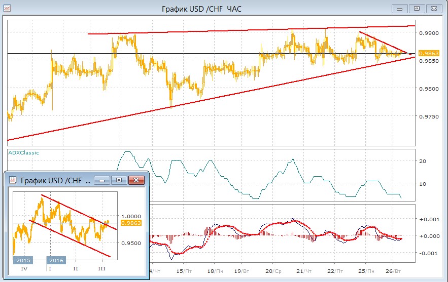 Франк сейчас ведет себя как тихая тень евро. Также зашел в узкий боковик, также притаился перед завтрашним решением ФРС. Ситуация здесь одновременно и интереснее и менее предсказуема, чем на евро. С одной стороны явно хлипкий выход из нисходящего канала на дневках, что говорит скорее всего о том, что на часовиках нас ждет плохо поддающийся прогнозированию диапазон. А вот с другой, долгое топтание у нижней границы большого треугольника на часовиках, что может вылиться в пробитие еще до ФРС или на самом ФРС. Если это пробитие будет до ФРС, то играть на нем не очень рекомендуется, а если на решении ФРС, то можно будет и зайти по движению, хотя ни цели ни стопы тут правильно рассчитать невозможно.