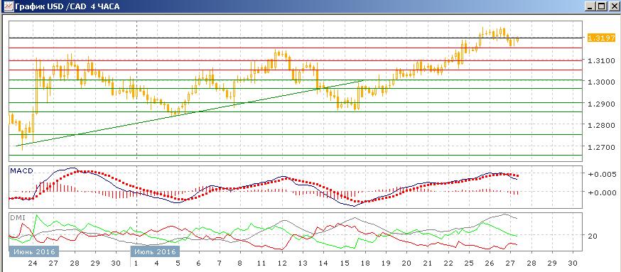 На дневном графике пара остаётся выше уровня 1,3150, ограничивавшего ранее рост пары с мая. То, что не было быстрого возвращения в широкий канал с мая, делает предпочтительным продолжение роста и далее. Уровень 1,3150 выступает уже поддержкой. По индикаторам направленного движения тенденцией остаётся рост — DM+ существенно выше DM- при росте ADX, гистограмма MACD остаётся в положительной зоне, линия MACD имеет положительный наклон. Если смотреть на дальнюю перспективу, размер диапазона с мая около 300 пунктов (если рассматривать его более узким) делает целью роста зону около 1,3450.