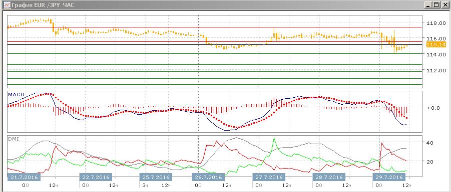 На четырёхчасовом графике коррекция вверх так и не дошла до важного уровня сопротивления на 117,35. После консолидации выше 116,00, но ниже 117,35 пара снизилась и достигла исходного уровня коррекции вверх, а далее достигла более низкого уровня ниже 114,00. Завершение коррекции, выхода из консолидации вниз и преодоление уровня, с которого начиналось коррекционное движение, делает боле вероятным продолжение снижения, целью видится уровень 112,65 (сопротивление в начале июля).