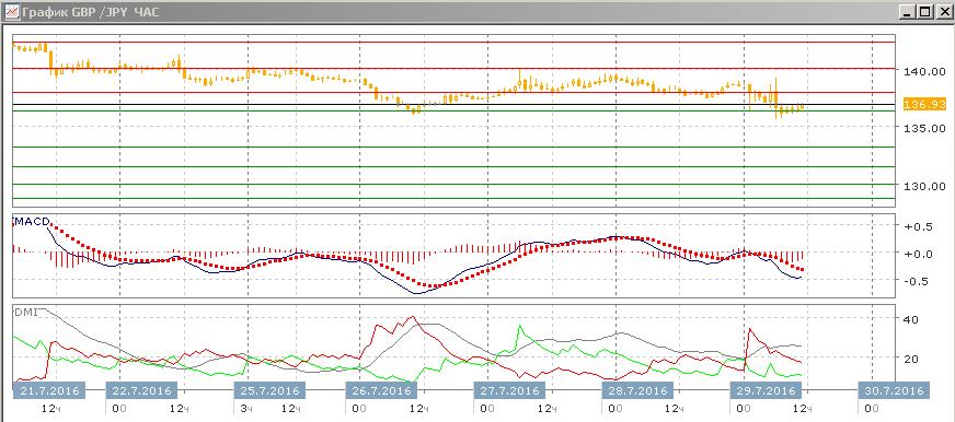 На дневном графике пара вернулась к уровню предыдущего относительного минимума, что делает возможным возобновление снижения с достижением более низких уровней. Последовательность снижения относительных максимумов пары не была нарушена. По ADX тенденция снижения становится лучше выраженной — превышение DM- над DM+ увеличивается. При закрытии ниже 136,40 стоит ожидать дальнейшего снижения пары, ближайшей целью видится 133,25 — минимум, достигнутый после референдума в Великобритании.