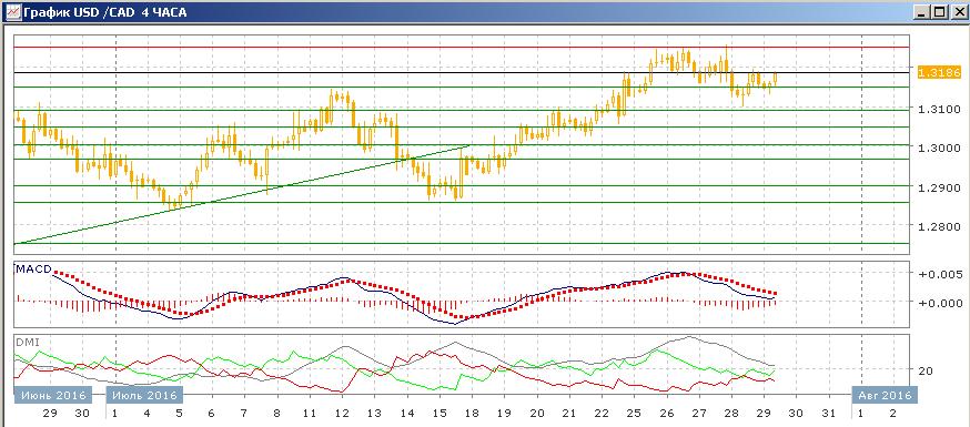 На четырёхчасовом графике волна снижения от 1,3250 приостановилась выше 1,3100, и сейчас пара растёт от этого уровня. Скорее, можно предполагать завершение снижения от 1,3250 до 1,3100 как коррекционного к росту от 1,2855 до 1,3250. Исходя из этого, уровень начала коррекции 1,3250 видится первичной целью роста. Исходя из более долгосрочной тенденции (рост остаётся тенденций по ADX и пара выше ключевого уровня сопротивления 1,3150) предпочтительным видится продолжение движения.