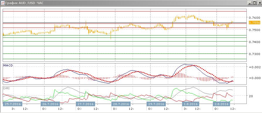 На часовом графике пара вновь выросла выше 0,7550 — это важный уровень конца июля и начала августа. То, что уровень поддержки на 0,7500 устоял, а сопротивление на 0,7550 было преодолено, делает более предпочтительным продолжение роста в краткосрочной перспективе.
