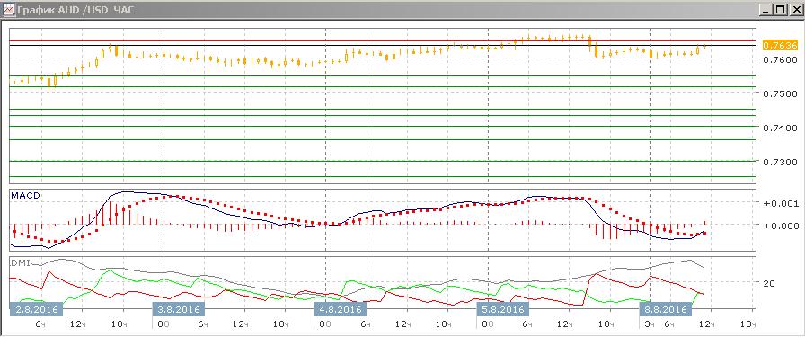На четырёхчасовом графике рост пары продолжается — относительные минимумы растут от 0,7430, сейчас пара получила поддержку на 0,7600. Тенденция роста ослабевает — по индикаторам направленного движения рост уже не является тенденцией, DM- и DM+ близки, гистограмма MACD находится в отрицательной зоне, линия MACD имеет отрицательный наклон. Уровень 0,7650 может вновь тестироваться, но так как это очень сильный уровень сопротивления, рассчитывать на продолжение роста рискованно.