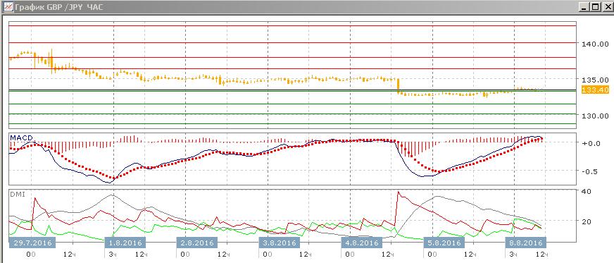 На дневном графике пара достигла первичной цели снижения на 133,25, на минимуме после референдума в Великобритании. В целом ситуация не изменилась, снижение продолжается, последовательность снижения относительный максимумов и минимумов пары от 142,35 не нарушена. Снижение пары после образования свечей «дожи» показывает выбор рынка в период неопределённости. Закрытие в пятницу было ниже 133,25. Целью дальнейшего снижения видится уровень поддержки июля — на 130,00.