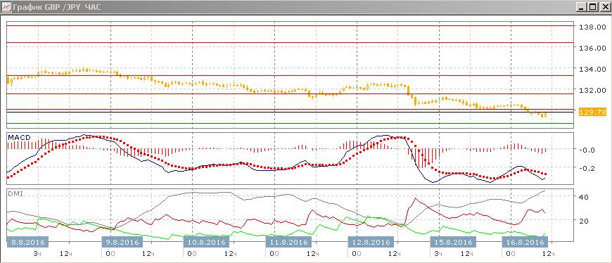 На дневном графике пара достигла уровня 130,00, который виделся целью снижения — это уровень поддержки июля. Далее только минимум июля — на 128,75, и скорее этот уровень будет тестироваться, так как тенденция снижения сильный (при снижении от 142,50 не было существенных попыток роста). По ADX тенденция снижения остаётся хорошо выраженной — превышение DM+ над DM- значительное и устойчивое при росте ADX. По гистограмме MACD минимум, однако, вряд ли будет подтверждён, что привело бы к образованию бычьего расхождения минимумов пары и гистограммы MACD, а это увеличило бы вероятность отскока. Пока продолжение снижения видится предпочтительным — направление хорошо выражено, сильный уровень поддержки 130,00 был пройден сходу (если будет закрытие ниже 130,00 во вторник).