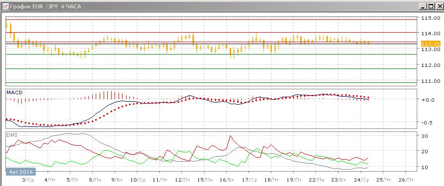 На четырёхчасовом и часовом графике пара преодолела уровень поддержки 113,40 и перешла к снижению. Виден разворот краткосрочной тенденции (теперь пара снижается, относительные максимумы и минимумы снижаются), целью движения видится следующий сильный уровень поддержки на 112,65. По индикаторам направленного движения пара тоже перешла к снижению: DM- выше DM+, гистограмма MACD находится в отрицательной зоне, линия MACD имеет отрицательный наклон.