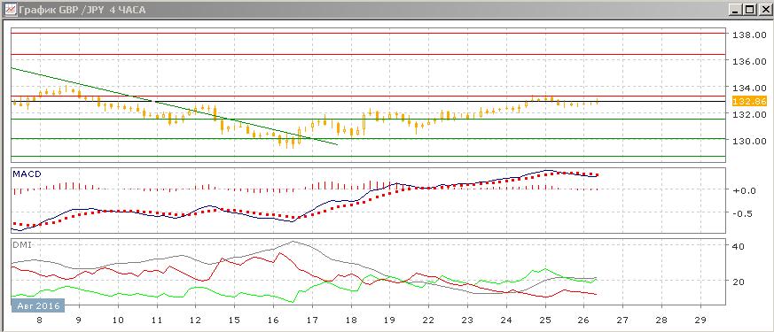 На четырёхчасовом графике пара тестировала уровень 133,25, после чего произошёл откат, но она остаётся вблизи этого уровня Последовательность роста относительных минимумов пары не нарушена, по ADX тенденцией является рост, превышение DM+ над DM- значительное при росте ADX. Ближайший сильный уровень поддержки на 132,00. Скорее, до выступления председателя ФРС Джанет Иеллен в 17:00 пара будет оставаться в текущих границах (132,00-133,25), далее стоит действовать в сторону выходе пары за эти границы, так как снижение ниже 132,00 покажет разворот во внутридневном масштабе, а выход выше 133,25 открывает дорогу к росту и на дневном графике.