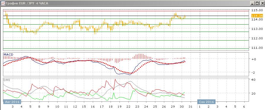 На четырёхчасовом и часовом графиках хорошо видно преодоление уровня сопротивления 114,00: после того, как пара выросла выше этого уровня, произошёл откат, и пара нашла поддержку на прежнем уровне сопротивления 114,00. Пока пара остаётся выше 114,00, рост предпочтителен. Исходя из размера предыдущей консолидации в с 135 пунктов, целью для роста видится уровень 115,35.