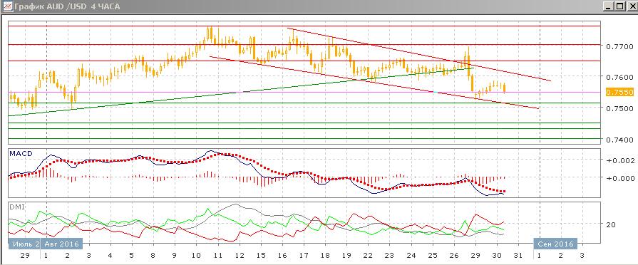 На четырёхчасовом графике снижение после отскока от 0,7550 возобновилась, и пара вернулась к 0,7650. Верхняя граница нисходящего канала от 12 августа не было достигнута. Целью снижения сейчас видится нижняя граница канала, это будет близко к уровню поддержки на 0,7515. Сопротивление на 0,7600 как бывшем уровне поддержки усиливается тем, что рядом находится верхняя граница канала.