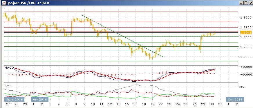 На четырёхчасовом графике пара консолидируется выше 1,3000 после того, как уровень был преодолён. Верхняя граница консолидации — 1,3050. Пока пара выше 1,3000 рост видится предпочтительным. По индикаторам направленного движения тенденцией стал рост: DM+ выше DM-, гистограмма MACD выше нуля, линия MACD имеет положительный наклон.