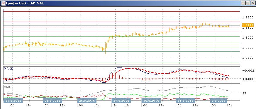На дневном графике пара почти достигла следующего уровня сопротивления 1,3150. Так как все значимые уровни коррекции уже пройдены, ближайшей целью становится начало волны снижения 8 августа на 1,3200. По индикаторам направленного движения тенденция стал рост: гистограмма MACD растёт в положительной области, линия MACD получила положительный наклон, DM+ выше DM-. Ближайшая поддержка вероятно будет на 1,3100 — как круглом уровне и уровне, на котором пара получила поддержку после отката от 1,3150.