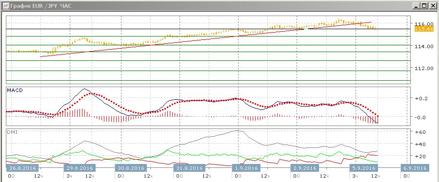 На дневном графике рост после закрытия выше сопротивления на 114,80 (максимум конца июня) продолжится. Ситуация не изменилась — уровень 115,00 выступил сопротивлением, пара продолжила рост после выхода из консолидации 112,65-114,00. По индикаторам направленного движения тенденция роста укрепляется: гистограмма MACD растёт в положительной зоне, линия MACD имеет положительный наклон, превышение DM+ над DM- увеличивается. Скорее, даже при возможности коррекции к росту он остаётся предпочтительным с целью на зоне сопротивления около 118,00 (уровень сопротивления в середине июля).