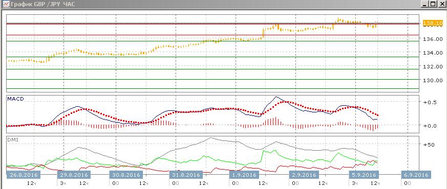 На четырёхчасовом графике видно, что пара после преодоления уровня 138,00 откатилась обратно, и получила поддержку на этом уровне. Поддержка на бывшем уровне сопротивления подтверждает продолжение тенденции роста. По ADX тенденция роста сильная — превышение DM+ над DM- значительное при росте ADX. Темп роста начинает замедляться — было медвежье расхождение максимумов пары и гистограммы MACD.