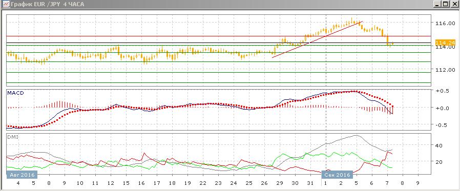 На четырёхчасовом графике пара продолжила снижение после преодоления краткосрочной линии восходящего тренда от 26 августа. Относительные максимумы и минимумы пары последовательно снижаются, тенденция усиливается — превышение DM- над DM+ увеличилось, гистограмма MACD продолжает снижаться в отрицательной области. Отскок вверх от уровня 114,00 небольшой, и уровень, скорее, снова будет тестироваться.