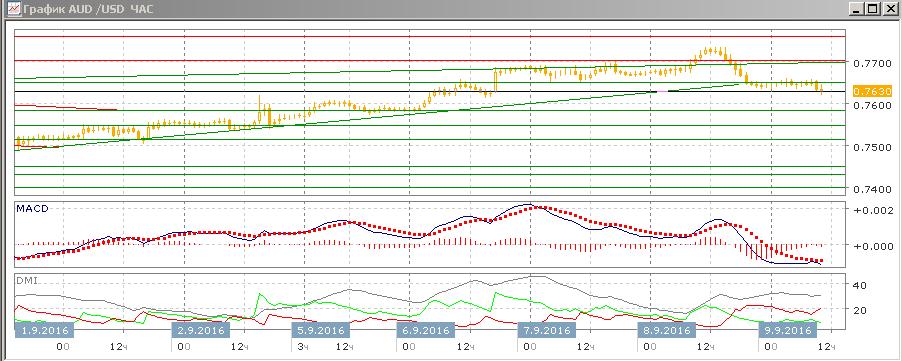 Пара протестировала уровень 0,7700 и затем снизилась. Сила уровня подтвердилась — образовалась свеча близкая к «падающей звезде», закрытие было ниже уровня. Пара достигла краткосрочной восходящей линии тренда с начала сентября. Пара остаётся выше верхнего уровня нисходящего канала от 0,7760. По ADX тенденцией остаётся рост — DM+ существенно выше DM-. Пара также преодолела уровень предыдущего относительного максимума 26 августа. Откат от 0,7700 был также откатом от восходящей линии тренда с мая - пара вернулась к ней после преодоления в конце августа. Это делает более предпочтительным возобновление снижения, но пара продолжает находиться около сильной зоны поддержки на 0,7650.