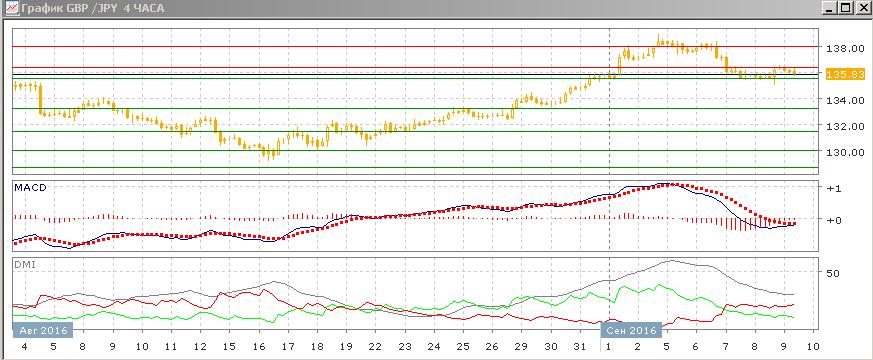 На дневном графике снижение продолжилось и пара установила новый минимум около 135,00. Поддержку пара получила на уровне 135,00. Последовательность роста относительных максимумов и минимумов от 130,00 не нарушилась. По индикаторам направленного движения сохраняется прежняя картина: гистограмма MACD снижается при положительном наклоне линии MACD. Превышение DM+ над DM-, также сохраняется.