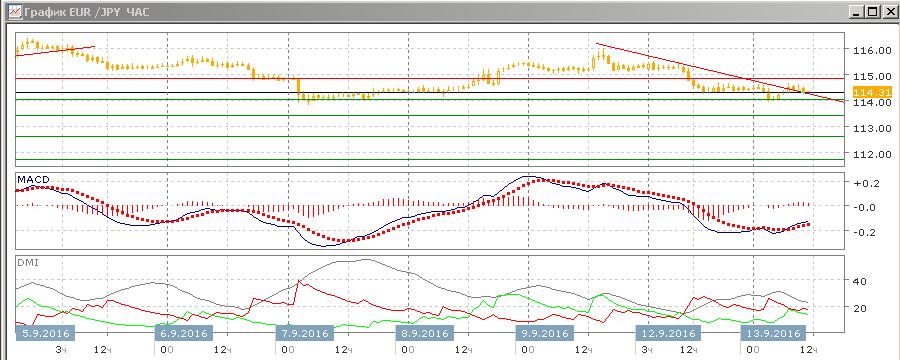 На часовом графике пара вернулась к уровню 114,40, около которого происходила консолидация в узком диапазоне в конце 12 сентября перед тестированием уровня 114,00 в течение азиатской сессии. Выход пары из консолидации вверх поменял бы тенденцию снижения. Пара уже преодолела нисходящую линию краткосрочного тренда, что делает рост более вероятным.