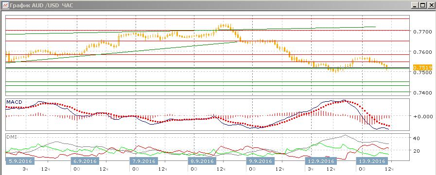 На четырёхчасовом графике пара возобновила снижение после отскока вверх от 0,7500. Пара почти вернулась к исходному уровню начала коррекции. Скорее, уровень 0,7500 ещё будет тестироваться. По индикаторам направленного движения тенденцией является снижение: DM- выше DM+, гистограмма MACD остаётся в отрицательной зоне, линия MACD сохраняет отрицательный наклон.