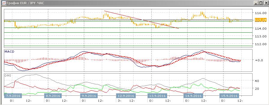 На часовом графике пара последовательно снижается после достижения уровня 116,00, последовательность снижения относительных минимумов и максимумов пары не нарушена. Тенденция снижения слабая (это видно по небольшому превышению DM- над DM+ при низком уровне ADX), но она видна. Скорее, снижение будет продолжаться, так как признаков разворота не видно.