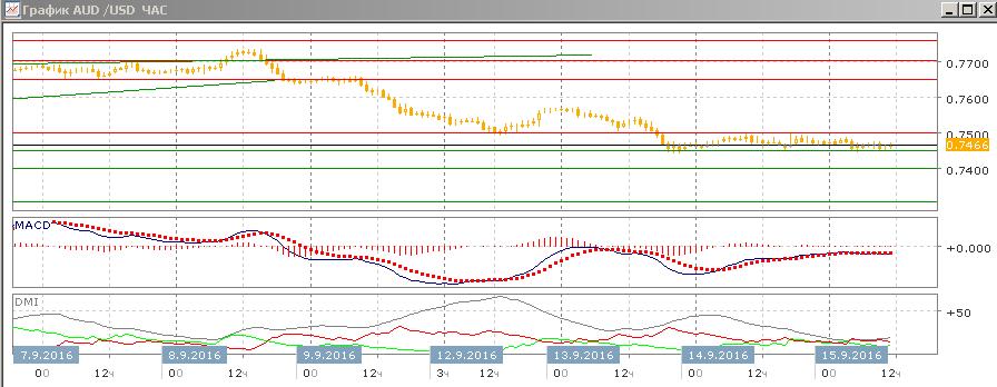 На дневном графике пара закрылась ниже уровня поддержки 0,7500, ниже уровня относительного минимума конца августа. Это открывает дорогу к дальнейшему снижению пары. Был достигнут следующий уровень поддержки 0,7450, это уровень поддержки в конце июля, однако скорее снижение будет продолжено до следующего «круглого» уровня 0,7400. В конце 2015 г. это уровень выступал сильным сопротивлением. Далее на 0,7300 — относительные минимумы июля и очередной «круглый» уровень, поддержка здесь может быть более сильной, и размер волны от 0,77 был бы уже довольно большим для коррекции.