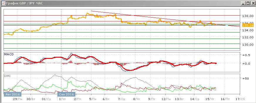 На четырёхчасовом графике пара постепенно снижается, и находится сейчас ниже 135,50. По индикаторам направленного движения — флэт. Сопротивление на 136,40 можно считать укрепившимся, так как пара ещё раз от него откатилась. Ближайшей поддержкой является уровень 135,00, это также около относительного минимума 8 сентября. Краткосрочная линия нисходящего тренда с 6 сентября пока не преодолена, и пока разворота не было, продолжение снижения кажется предпочтительным. На часовом графике флэт также хорошо виден, но нижнюю границу можно немного перенести — 135,00-136,40. Как и ранее, предпочтительным остаётся движение в направлении выхода пары из диапазона.