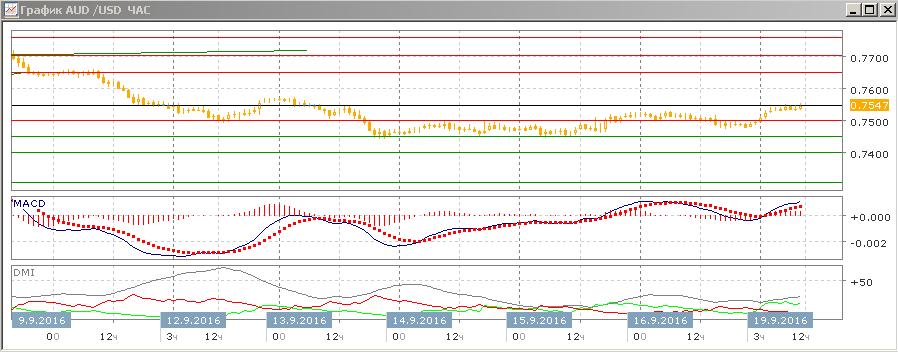 На четырёхчасовом графике пара выросла выше уровня сопротивления в консолидации 0,7450-0,7500. От 0,7450 пара растёт — относительные максимумы и минимумы последовательно растут. Пока пара выше 0,7500, рост в краткосрочной перспективе видится предпочтительным, но исходя из более широкой перспективы рассчитывать на него рискованно. По индикаторам направленного движения пара переходит к росту: DM+ выше DM-, гистограмма MACD находится в положительной зоне, линия MACD имеет положительный наклон.
