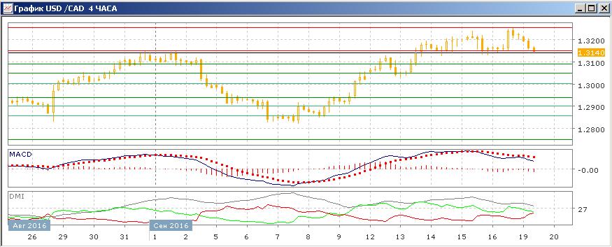 На дневном графике пара достигла целевого уровня роста в 1,3250, на максимуме июля. Поддержкой сейчас выступает уровень 1,3150, ранее сильный уровень сопротивления. При закрытии ниже 1,3150 откат от 1,3250 может продолжиться. Пока пара выше, более вероятным видится новое тестирование уровня 1,3250. Разворота тенденции роста не было — пара достигает новых максимумов. По индикаторам направленного движения тенденцией является рост: DM+ выше DM-, гистограмма MACD растёт в положительной зоне, линия MACD имеет положительный наклон.