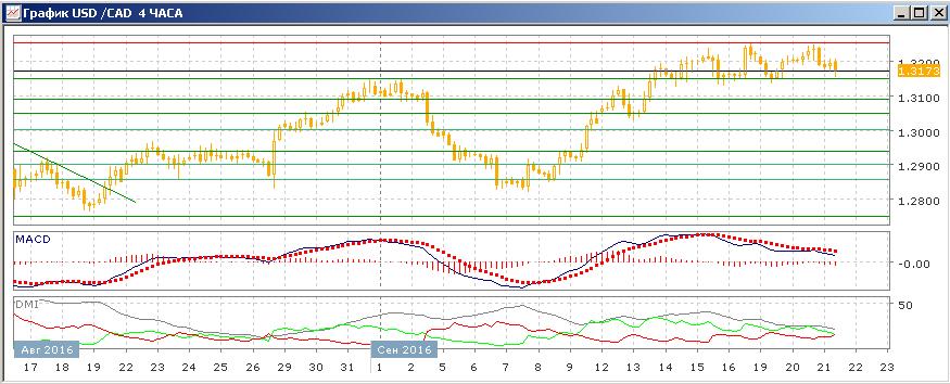 На дневном графике пара остаётся в консолидации 1,3150-1,3250. Скорее, выход из этой консолидации будет вверх, так как тенденция роста не нарушена, пара выше ключевого уровня поддержки на 1,3150 (там были относительные максимумы в июне, июле и августе). По индикаторам направленного движения тенденцией является рост: DM+ выше DM-, гистограмма MACD растёт в положительной зоне, линия MACD имеет положительный наклон. В рамках движения к консолидации более вероятным видится движение к верхней границе 1,3250, так как в среду пара приблизилась к нижней границе.