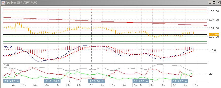 На дневном графике снижение приостановилось выше 130,00. Дальнейшее зависит от направления выхода пары за пределы треугольника, образованного краткосрочной линией нисходящего тренда (от 138,80) и уровнем поддержки на 130,00. Ранее около 130,00 происходит разворот вверх в июле и августе. В менее широкой перспективе тенденция снижения не изменилась: относительные максимумы и минимумы пары снижаются, DM- существенно выше DM+ при росте ADX, линия MACD имеет отрицательный наклон и гистограмма MACD перешла на отрицательную территорию.