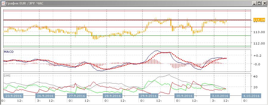 На четырёхчасовом графике около 114,00 образуется вторая вершина, также около 114,00 образовалось медвежье расхождение максимумов пары и гистограммы MACD. Скорее, пара будет снижаться от 114,00 с целью на нижней границе канала, это также уровень предыдущего минимума. Похожая картина на часовом графике — уровень 114,00 тестировался, но не был преодолён, и начала откат пары, который вероятно продолжится.