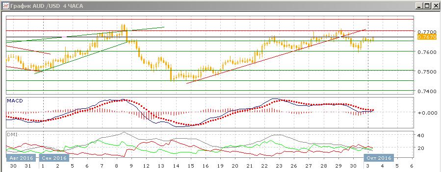 На дневном графике было закрытие ниже краткосрочной линии тренда с с 15 сентября, однако развития снижения не было поддержано на данный момент: пара получила поддержку на 0,7600, психологически важном уровне и относительном минимуме 26 сентября. Последовательность роста относительных максимумов и минимумов пары не нарушена, по индикаторам направленного движения рост остаётся тенденцией — превышение DM+ над DM- устойчивое, гистограмма MACD остаётся в положительной зоне, линия MACD сохраняет положительный наклон. Откат пары от 0,77, однако, показывает что уровень сопротивления остаётся сильным, рассчитывать на рост выше него пока преждевременно — стоит дождаться закрытия выше этого уровня.