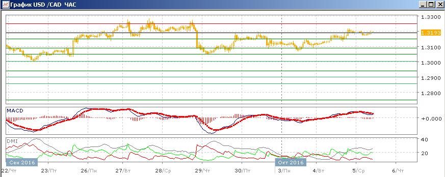 На дневном графике происходит отскок вверх от 1,3100, ограниченный сейчас уровнем 1,3200. Пара находится в прежних границах — ниже сильного уровня сопротивления на 1,3250, но выше относительных минимумов второй половины сентября на 1,3000 и 1,3050. По индикаторам направленного движения явной тенденции нет — ADX на низком уровне при близости DM- и DM+, гистограмма MACD около нуля. В более длительной перспективе снижение кажется предпочтительным, так как верхняя граница долгосрочного (с мая) канала 1,3250 является уровнем, предпосылок к преодолению которого пока не видно. С точки зрения фундаментальных факторов преодоления 1,3250 возможно: канадский доллар не получил существенной поддержки от значительного роста цены на нефть. Последовательность роста относительных максимумов и минимумов пары от 1,2800 не нарушена. Следовательно, пока разворота тенденции роста нет, с расчётом на снижение в горизонтальном канале лучше подождать.