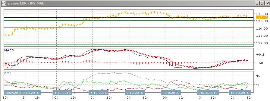 На дневном графике пара откат от уровня 116,00 (а также от максимумов сентября) не развился и пара получила поддержку на ближайшем уровне поддержки 115,00. В целом ситуация не изменилась — пара остаётся примерно на прежнему уровне, сопротивление на 116,00 сохраняется, отскок от 115,00 пока был слабым. Последовательность роста пары от 112,65 не нарушена. По индикаторам направленного движения сохраняется слабая тенденция роста - DM+ выше DM-, гистограмма MACD находится положительную зоне, ADX на низком уровне. Дальнейшую перспективу, вероятно, определит направление выхода пары за пределы 115,00-116,00.