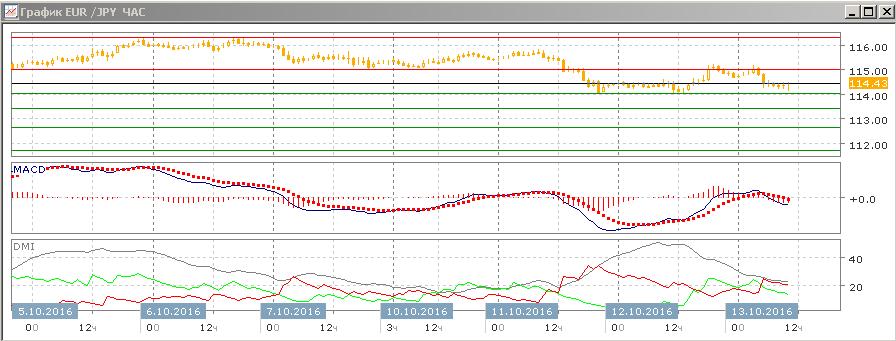 На четырехчасовом графике пара вновь приближается к 114,00 после коррекции вверх до 115,00. Последовательность снижения относительных максимумов и минимумов пары от 116,30 не нарушена. По индикаторам направленного движения тенденцией является снижение — DM- выше DM+, гистограмма MACD остаётся в отрицательной зоне, линия MACD сохраняет отрицательный наклон. Скорее, уровень 114,00 будет преодолён и пара продолжит движение вниз.