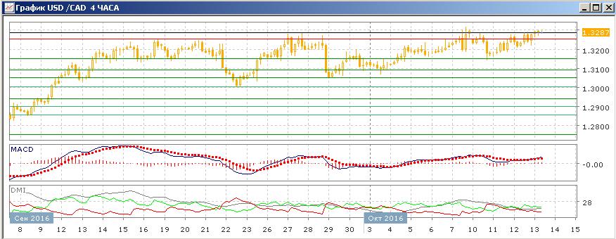 На четырёхчасовом графике приближается к следующему «круглому» уровню 1,3300, от которого произошёл откат вниз 7 октября. Предпочтительным сейчас видится преодоление этого уровня сопротивления, так как коррекционное движение вниз завершилось, а в целом тенденция роста в сохраняется. Ключевым уровнем поддержки в этом масштабе видится 1,3150 — около него пара развернулась 10 октября, также это уровень поддержки в середине сентября.