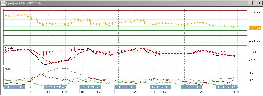 На дневном графике закрытия ниже 114,00 пока не было, если это произойдёт в среду, то следующей целью для пары будет видеться снижение до уровня поддержки 112,65, который проявлялся в августе и сентябре. По индикаторам направленного движения снижение становится более выраженной тенденцией: гистограмма MACD снижается уже в отрицательной зоне, линия MACD разворачивается вниз, превышение DM- над DM+ сохраняется.