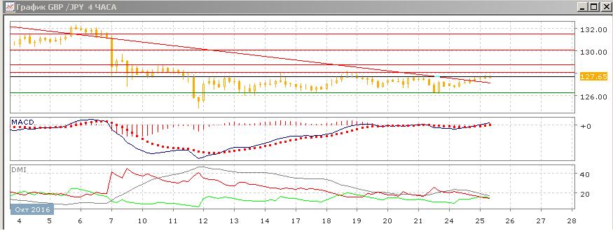 На дневном графике пара приближается к выходу из треугольника, образованного нисходящей линией тренда с начала сентября и уровнем 126,25. При разном построении тренда пара сейчас может быть как выше него, так и немного ниже, однако это не меняет общей картины: выход будет или вверх, или вниз. Сейчас стоит понаблюдать за тем, как изменится картина. В пользу возобновления снижения — то, что тенденция снижения остаётся сильно, линия тренда пока не преодолена, по ADX снижение является сильной тенденцией, DM- выше DM- при высоком уровне ADX. Последовательность снижения относительных максимумов пары не нарушена. Однако устойчивость уровня 126,35 и образование бычьего расхождения минимумов пары и гистограммы MACD делает ситуацию примерно нейтральной.