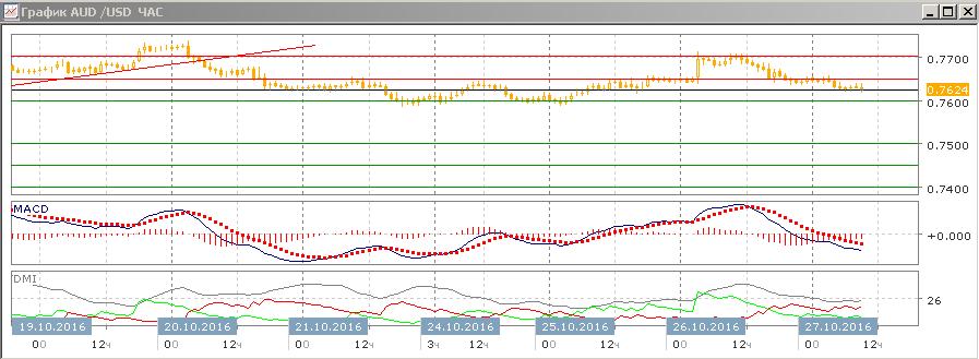 На четырёхчасовом графике образовалась двойная вершина около 0,7700, пара движется к промежуточному минимуму на 0,7600, и скорее уровень будет достигнут. Дальнейшее направление должно определиться по результатам тестирования уровня 0,7600. По индикаторам направленного движения в этом масштабе сохраняется флэт. На часовом графике пара постепенно снижается от 0,7700, относительные максимумы и минимумы снижаются, по индикаторам направленного движения тенденцией стало снижение — DM- выше DM+, гистограмма MACD остаётся в отрицательной зоне, линия MACD сохраняет отрицательный наклон, ближайшей целью является тестирование уровня 0,7600.