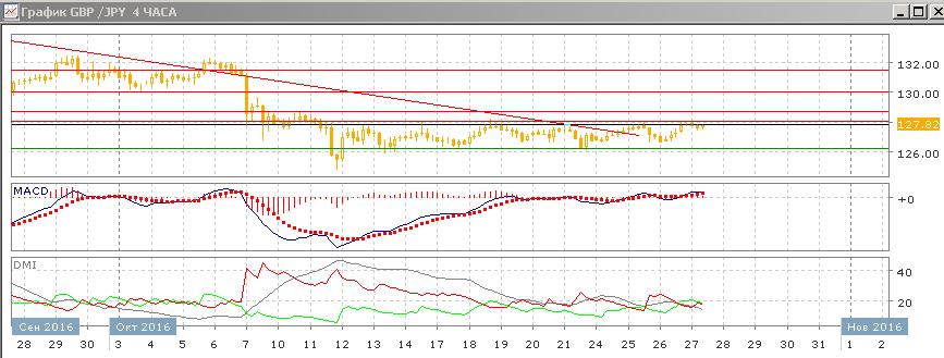 На дневном графике существенное изменение — пара находится выше линии нисходящего тренда с начала сентября, однако пока не преодолён уровень сопротивления на верхней границе диапазона с 10 октября (128,00). Сочетания выхода пары из диапазона вверх и преодоления линии нисходящего тренда сделало бы продолжение движения вверх предпочтительным. Гистограмма MACD растёт уже в положительной зоне, линия MACD разворачивается вверх — это говорит о возможном развороте тенденции, которого, однако, пока не случилось (последовательность снижения относительных максимумов пары не нарушена).