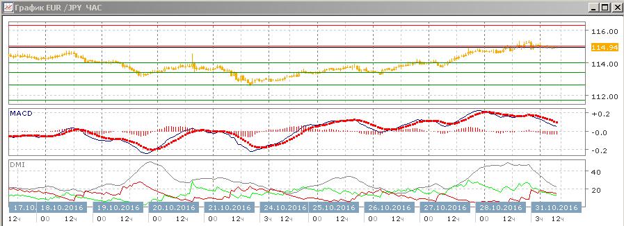 На четырехчасовом графике рост приостановился у уровня 115,00. Тенденция роста в этом масштабе сильная и она не нарушена: относительные максимумы и минимумы последовательно растут от 112,65, по ADX тенденция роста является сильной (превышение DM+ над DM- большое при росте ADX, уже находящегося на высоком уровне. Сейчас видно замедление тенденции (гистограмма MACD снижается) но скорее рост будет продолжаться и при откате. Уровень 115 ограничивал рост пары 12 и 14 октября, далее сильный уровень сопротивления только 116,30.