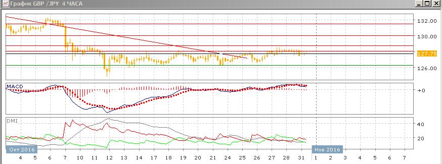 На дневном графике нет изменений: пара находится выше линии нисходящего тренда с начала сентября, однако пока не преодолён уровень сопротивления на верхней границе диапазона с 10 октября (128,00). Уровень тестировался несколько сессии, но закрытия были в диапазоне. Сохранение пары выше линии тренда с начала сентября делает предпочтительным выход из диапазона вверх. По индикаторам направленного движения происходит коррекция к снижению — по ADX тенденция снижения остаётся хорошо выраженной, превышение DM- над DM+ устойчивое, ADX на высоком уровне. Коррекционное движение видно по росту гистограммы MACD и развороте линии MACD вверх. Дальнейшее движение, скорее, будет в направлении выхода пары из диапазона 126,25-128,00.
