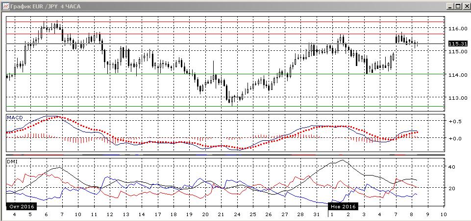 На четырехчасовом графике пара снижается от уровня 115,70 — около этого максимума начала ноября образовалась ещё одна вершина, гэп вверх может быть закрыт при движении ниже 115,00, и тогда предпочтительным будет продолжение снижения к промежуточному минимуму между вершинами на 114,00. Если вернуться к основному фундаментальному фактору дня — выборам в США — то при более вероятном исходе (победе Клинтон) вероятен рост пары из-за ослабления иены, в этом случае выход из канала вверх, через уровень 116,30, видится вполне возможным. Более краткосрочно технические факторы вряд ли определяют ближайшее движение: до результатов рынок, вероятно, будет в ожидании, а после находиться под воздействием новостей, а не технических факторов.