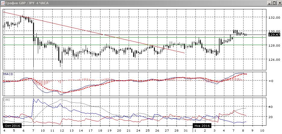 На четырёхчасовом переход к росту пары виден лучше: рост после периода флэта между 126 и 128 виден, пара закрепилась выше предыдущего диапазона. От 130,00 происходит откат, но он небольшой и учитывая важность этого уровня сопротивления, он и должен был быть. Дальнейшую перспективу для пары, скорее, определит фундаментальная картина: исход президентских выборов в США и реакция на него. С технической точки зрения для пары более предпочтителен рост, и на новостном факторе уровень сопротивления 130,00 может быть преодолён. Более краткосрочно, скорее, будет продолжаться движение около текущего уровня до появления результатов выборов в США, так как существенных экономических данных до этого не ожидается.