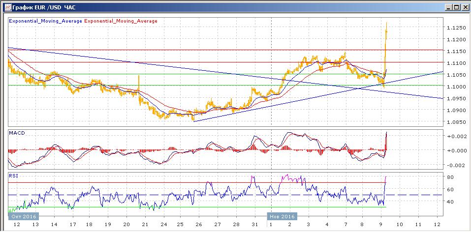 Пара в понедельник и вторник постепенно снижалась, потеряв порядка 80 пунктов и закрытием на 1.1014. сегодняшние торги на новостях по выборам в США резко отправили пару вверх, пара сефчас торгуется выше 1.1200. Средние скользящие ЕМА21 и ЕМА55 пересеклись вверх и начинают расти. Индикаторы MACD и RSI вышли резко выше своих центральных линий и растут, RSI вошел в зону перекупленности. Дальнейшие новости будут определять динамику пары.