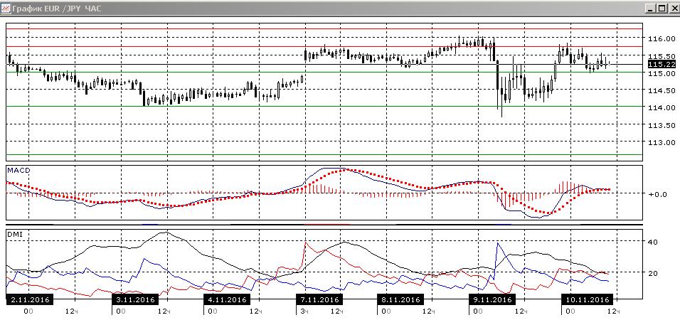На четырехчасовом графике пара при развороте вверх в среду от 114,00 движение приостановилось на уровне сопротивления 115,70 — как и в предыдущие три максимума в с начала ноября. Откат пары сейчас подтверждает силу уровня сопротивления и отсутствие на рынке энергии для прорыва вверх на данный момент. По индикаторам направленного движения флэт сохраняется: гистограмма MACD колеблется около нуля, DM+ и DM- близки. В рамках движения в диапазоне 114,00-115,70 предпочтительным видится снижение к нижней границе.